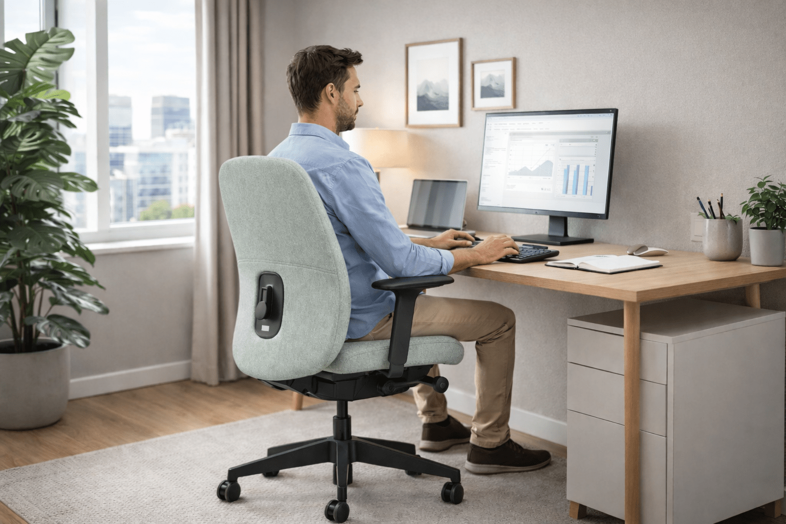 Der Interstuhl Hej Interior PLUS Edition verbindet wohnliches Design mit moderner Ergonomie. Weiche Formen, hoher Sitzkomfort und eine ergonomische S-Form treffen auf eine zeitgemäße Mechanik und alle relevanten Ergonomie-Features für den Arbeitsalltag.